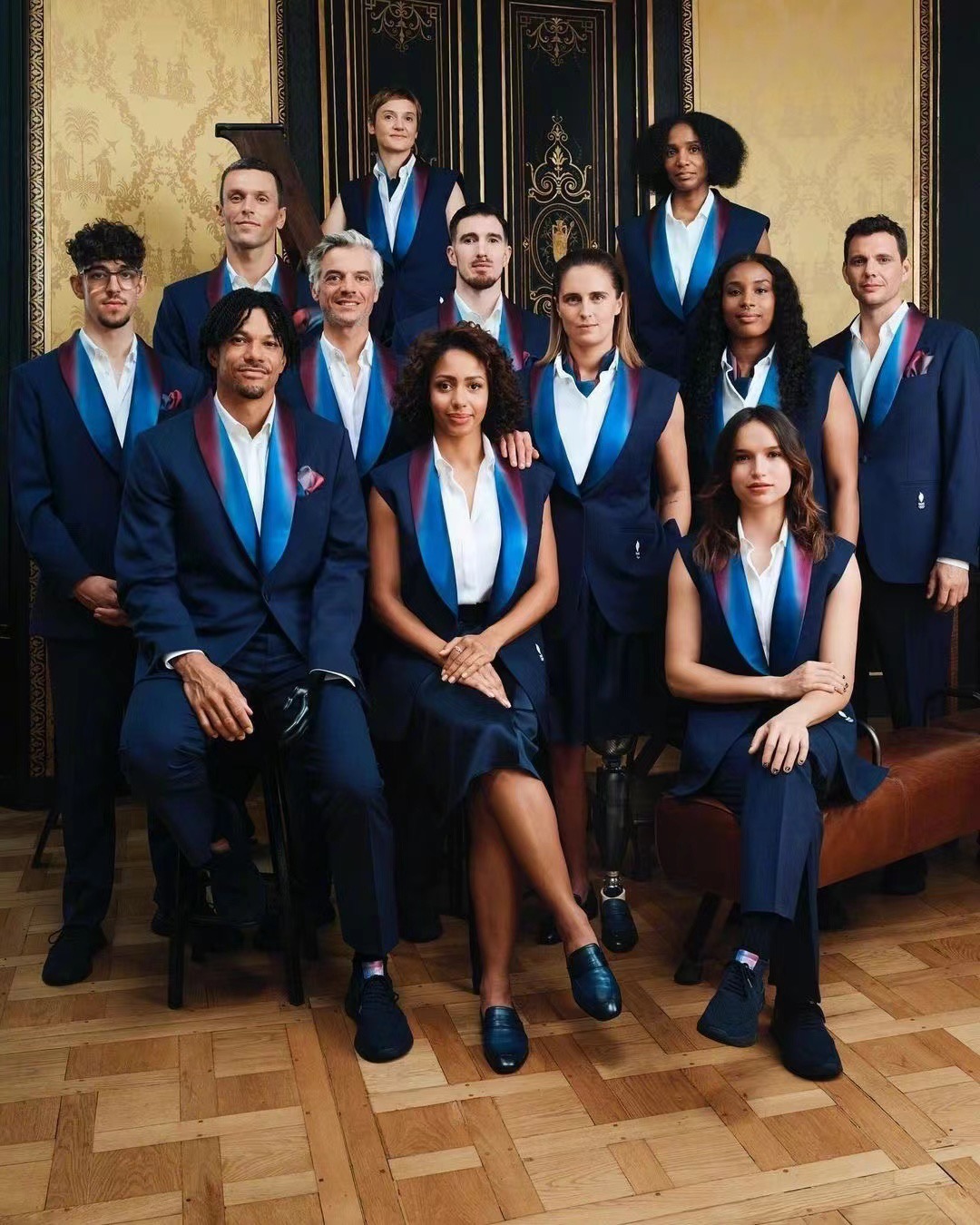 目前,中国体育代表团巴黎奥运会的开幕式礼服还未公开,但东道主法国代表团的开幕式礼服已经公开,由路威酩轩(LVMH)集团旗下奢侈品牌Berluti为其设计。礼服为深蓝色的西装,廓形修身,领口处采用红白蓝渐变效果,呼应法国国旗颜色。