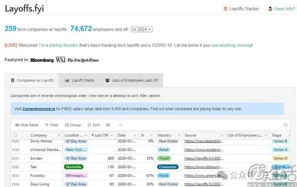 在一个海外网友建立的追踪疫情后硅谷科技公司裁员的网站中显示,2022年有1064家公司解雇了165269名员工,随后在2023年情况则进一步恶化,有1192家公司裁掉了263180名员工。就在仅仅过了不到1/3时间的2024年里,也有259家公司裁员74672人。