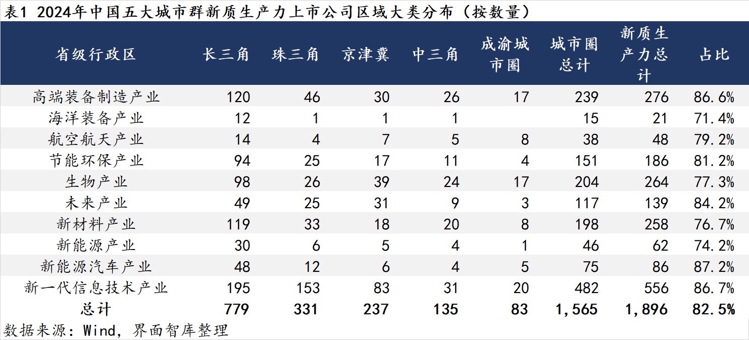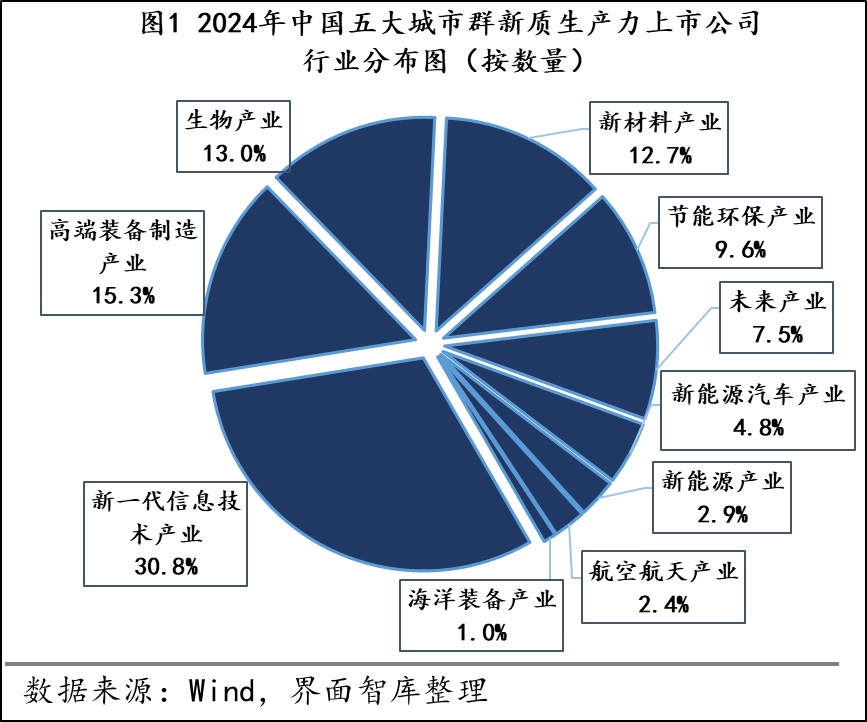 界面智库在“上市公司区域图鉴”系列报告的第八篇中,介绍了31个省级行政区(不包含港澳台地区)新质生产力上市公司的产业分布,本文在此基础上选取了长三角、珠三角、京津冀、中三角、成渝城市圈这五大城市群共计1565家新质生产力上市公司进行进一步的剖析。