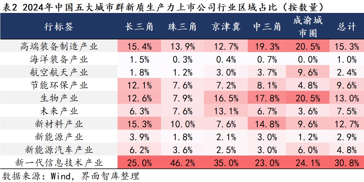 此前在界面智库整理的全国1896家新质生产力上市公司中,数量排名前三的产业分别是新一代信息技术产业、高端装备制造产业、生物产业,三者合计占比达57.8%。本次以五大城市群为对象进行观察发现,前三名的产业以及位序均未发生变化,但是合计占比有所提升,这三大产业占五大城市群新质生产力上市公司总数比重为59.1%,较全国范围的比重提升1.3个百分点,其中新一代信息技术产业占比提升1.5个百分点,高端装备制造产业占比提升0.7个百分点,生物产业占比下降0.9个百分点。