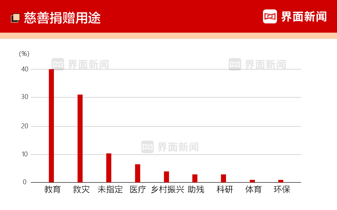 - 上榜统计中,40.44%的善款流向教育;受到京津冀暴雨、积石山地震的影响,救灾捐款的占比升至31.14%。