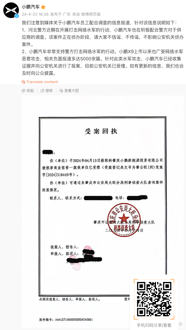2、小鹏汽车非常支持警方打击网络水军的行动。小鹏X9上市以来也广受网络水军恶意攻击,相关负面报道多达5000余篇。针对此类水军攻击,小鹏汽车已经收集证据并向公安机关进行了报案,目前公安机关已受理。如有更新的信息,我们也会及时向公众披露。