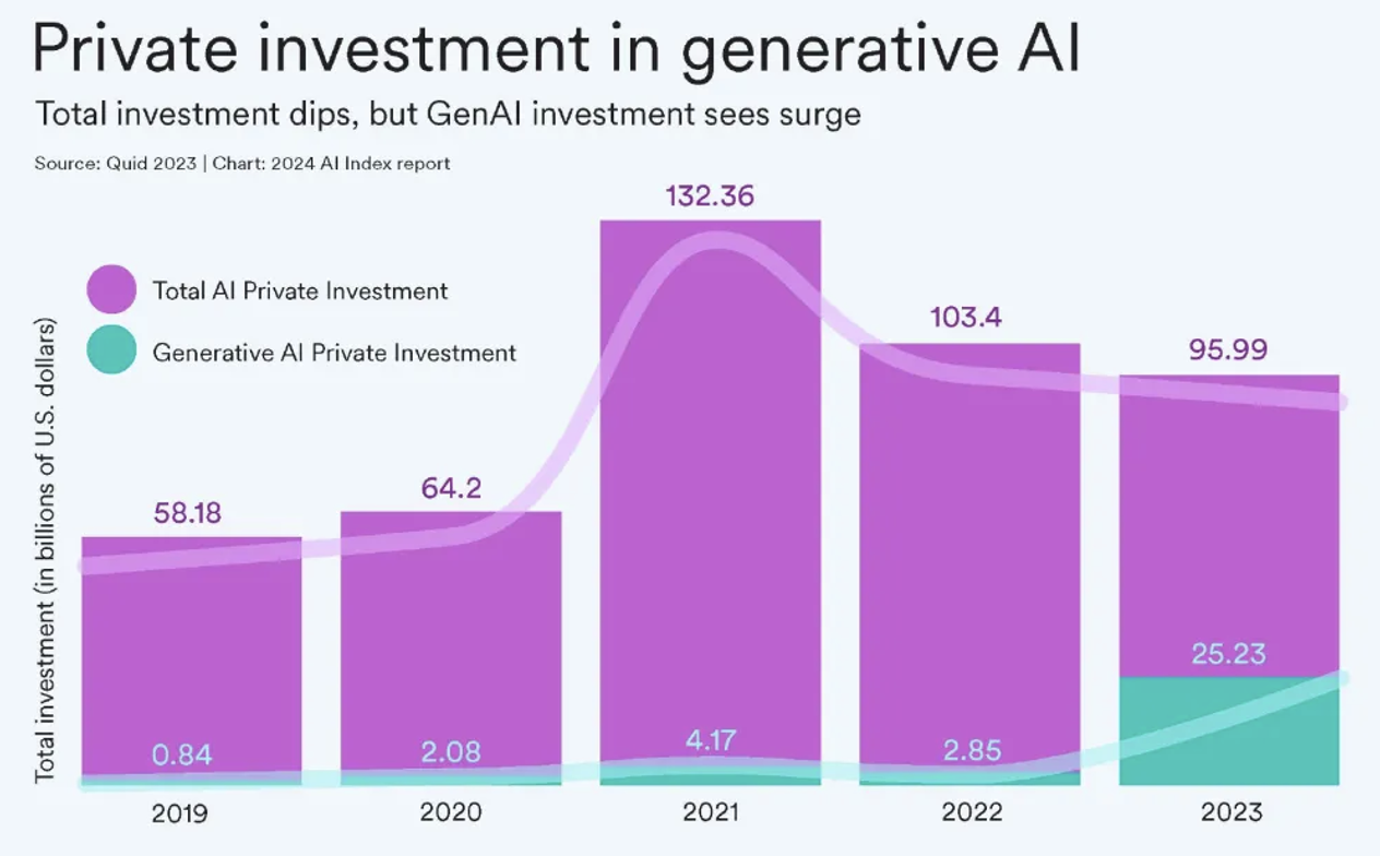 虽然2023年整体的人工智能民间投资整体下降,但对“生成式”AI 的投资是激增的,比较2022年(约30亿美元)增长了近八倍,达到252亿美元。海外的生成式AI主要参与者,包括 OpenAI、Anthropic、Hugging Face、Inflection等大模型公司,都获得了可观的融资。国内的大模型公司,如质谱、Minimax、百川智能、Minimax、零一万物、月之暗面等,也都获得不错的融资,虽然金额的数量级有很大的差距。