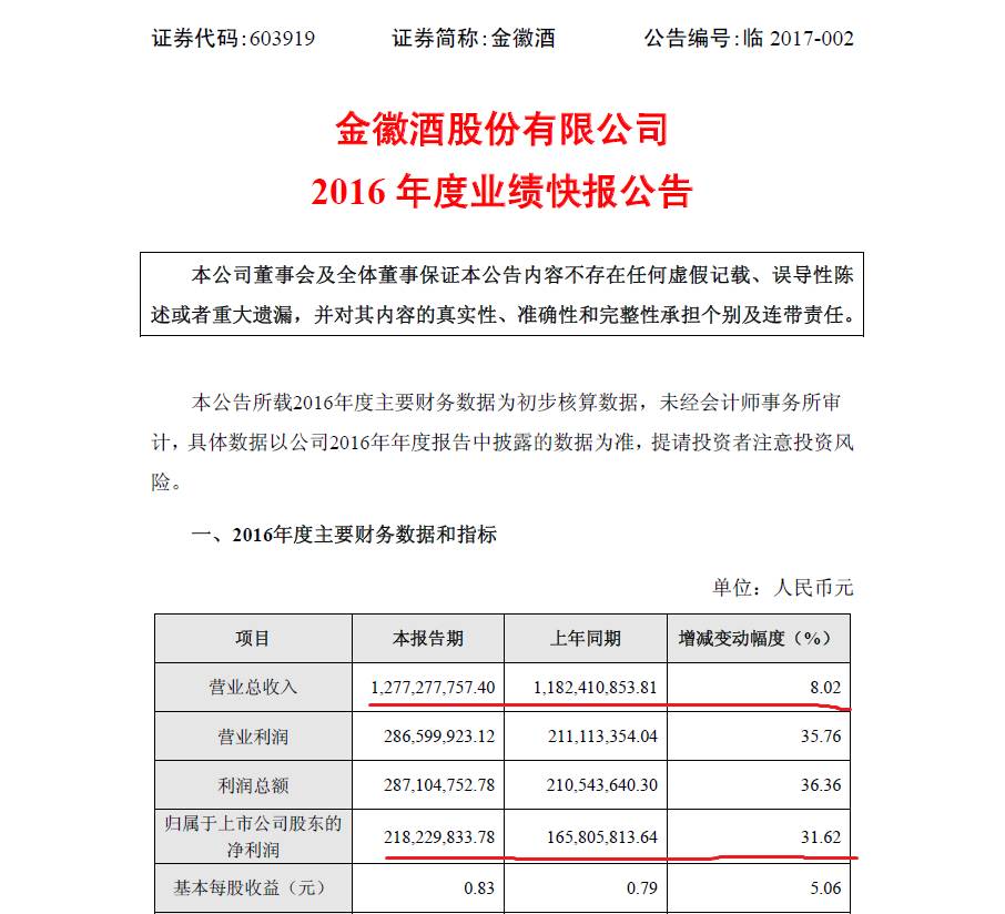 2月11日,金徽酒(603919.SH)在上交所公布了2016年度业绩快报公告,营业总收入约为12.77亿元,相较于2015年11.82亿元,增长8%左右;归属于上市公司股东的净利润约为2.18亿元,和2015年接近1.66亿元相比,增幅高达31.62%;换言之,金徽酒去年收入、利润双双“飘红”。