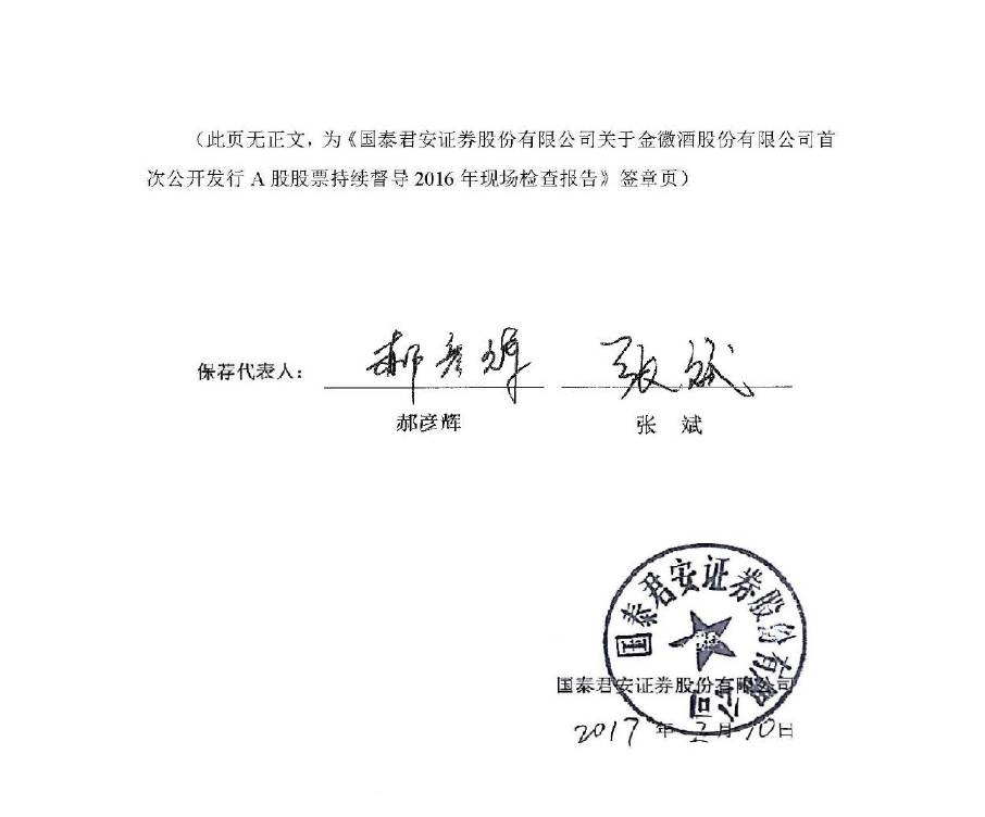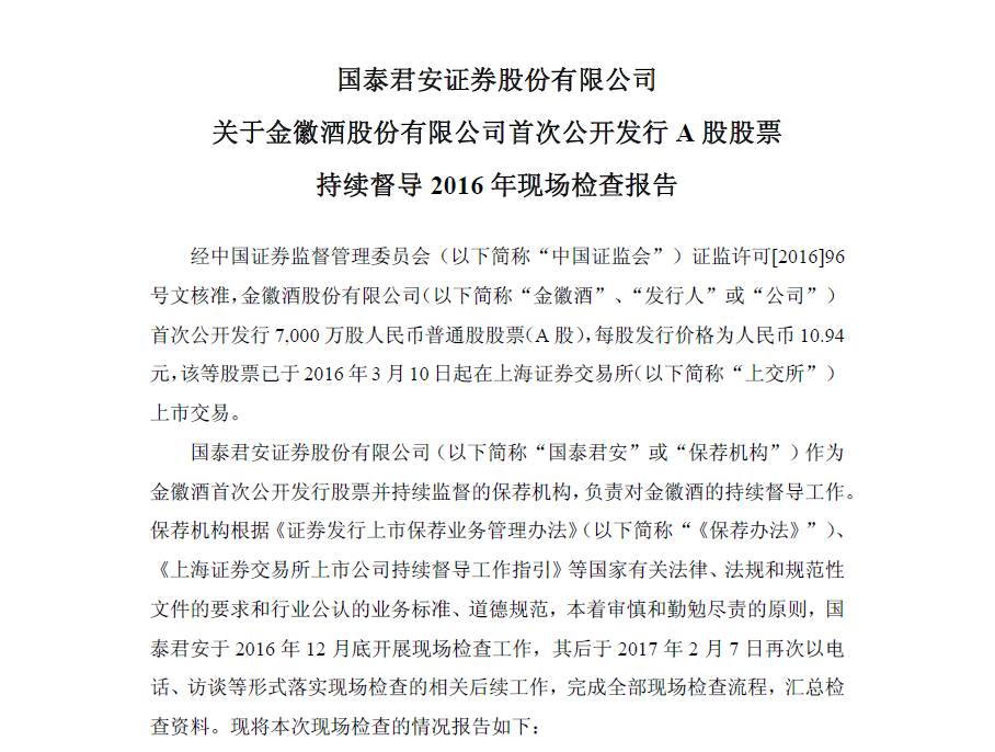 2月11日,金徽酒在上交所发布《国泰君安证券股份有限公司(下称“国泰君安”)关于金徽酒股份有限公司首次公开发行A股股票持续督导2016年现场检查报告》,引发资本市场关注。