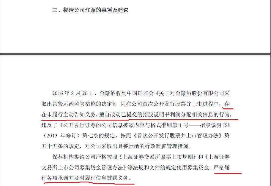 报告显示,2016年8月26日,金徽酒收到中国证监会《关于对金徽酒股份有限公司采取出具警示函监管措施的决定》,因在公司首次公开发行股票并上市过程中,存在未履行主动告知义务,擅自改动已提交的招股说明书利润分配相关信息的行为,违反了《公开发行证券的公司信息披露内容与格式准则第1号——招股说明书》(2015年修订)第七条的规定。