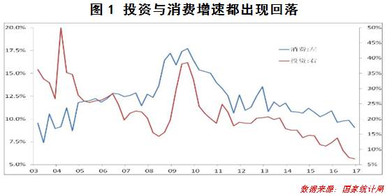 二是认为我国经济已经企稳。其实,虽然2016年我国GDP增速与2015年持平,但并不代表我国经济已经企稳,因为无论是投资、消费还是出口,这经济增长的三驾马车的增速都在下行(参见图1),这表明经济仍未实质企稳。