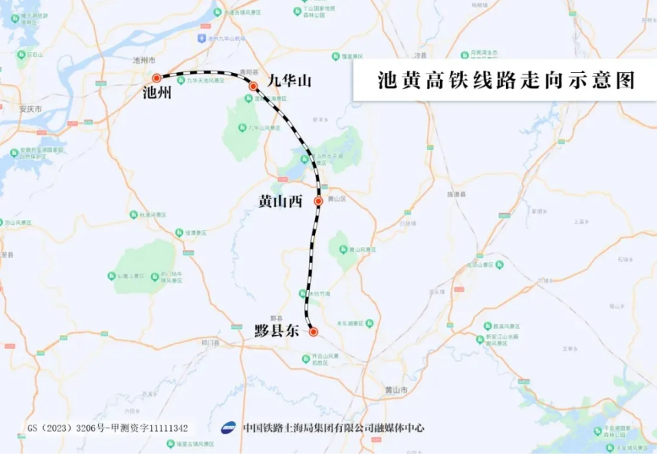 池黄高铁位于皖南山区,起自池州站,途经安徽省池州市贵池区、青阳县,黄山市黄山区、黟县,接入黟县东站,正线全长125公里,设计时速350公里。全线设池州、九华山、黄山西、黟县东4座车站,其中九华山、黄山西为新建车站,池州站为改扩建车站,黟县东站为既有车站。