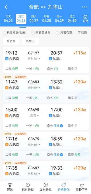 合肥南~黄山西C3691/4 C3693/2次、C3695/8 C3697/6次2对;
