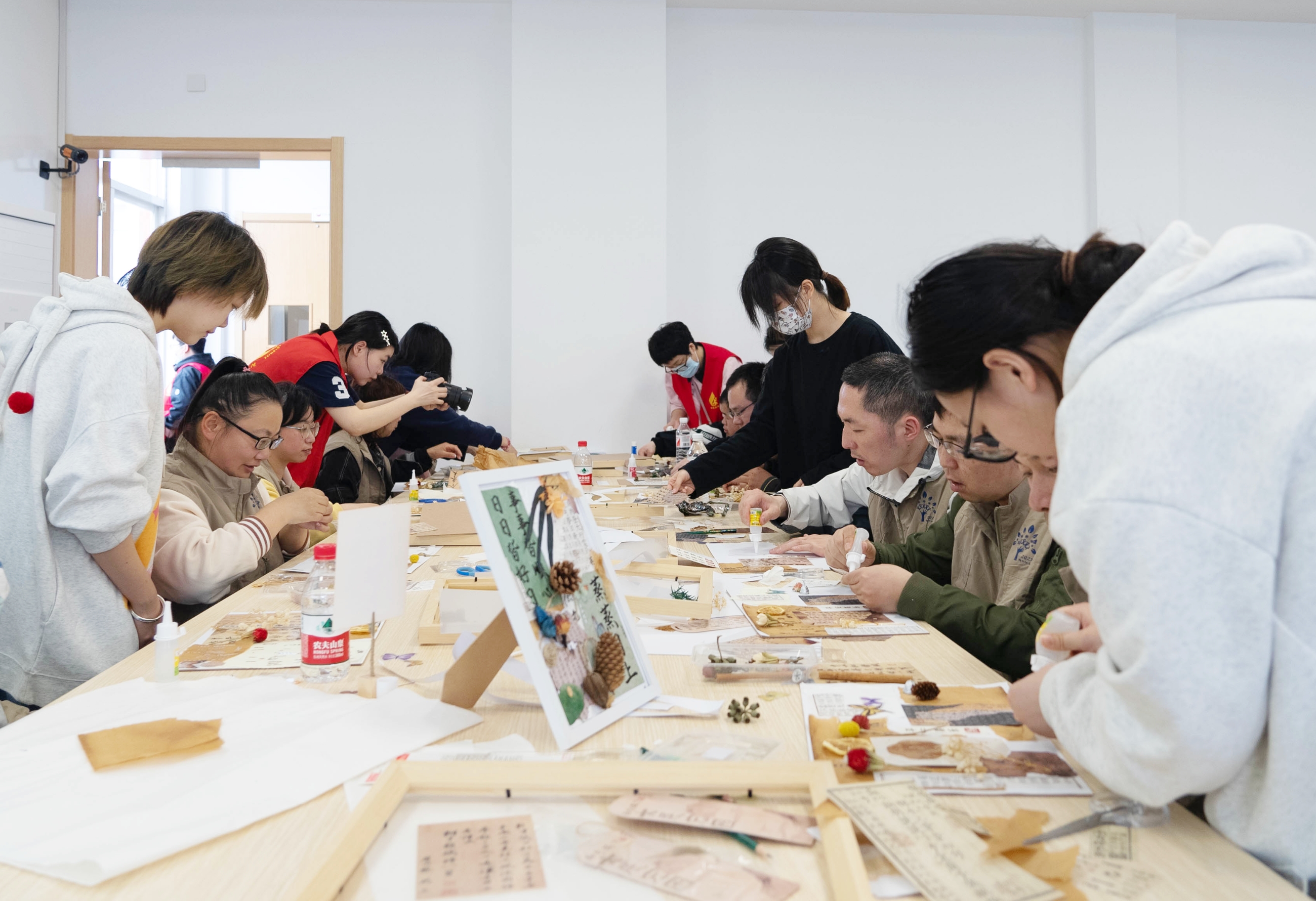 带着校园踏春的满满收获,随后,一场主题为“诗画绘叶间、指尖练康复”活动在轻松愉快的氛围中拉开帷幕。宁财院艺术设计学院教师俞奕秋为学员们介绍了课程主题,并指导他们利用踏春所得的花瓣和叶片,制作“诗意画韵”植物拼贴画。尽管学员们大多是首次参与此类艺术性康复训练,但在大学生志愿者的热心引导和协助下,他们逐渐掌握了制作技巧,并顺利完成了自己的作品。