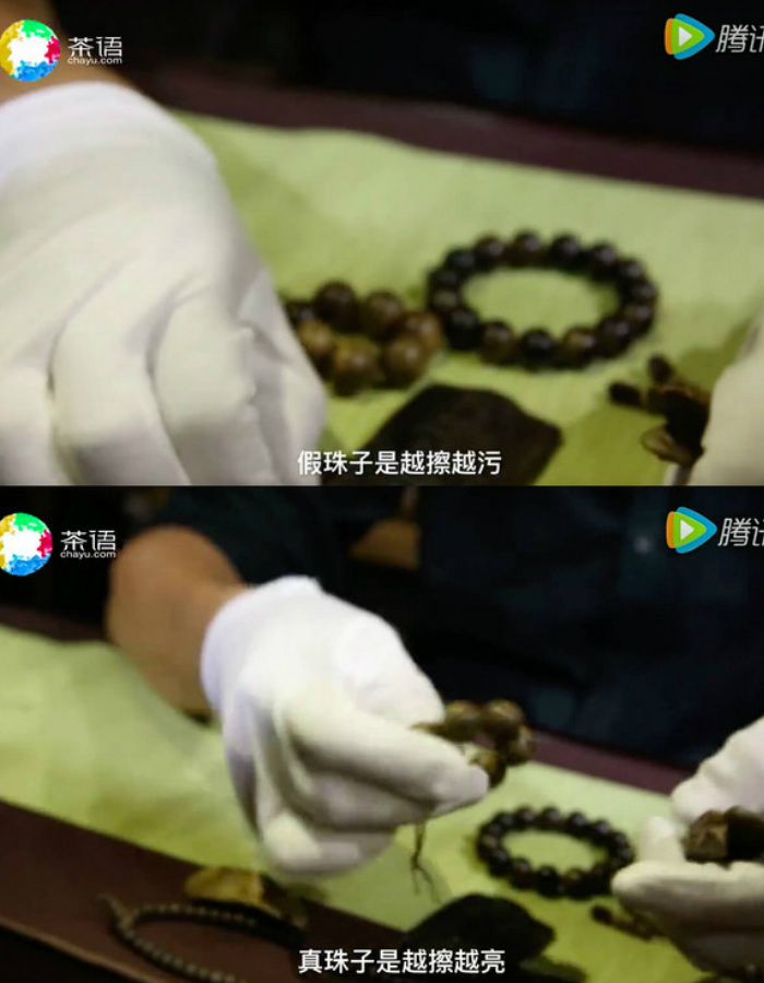 在用肉眼分辨之后,我们就可以上手摸一摸沉香。用手擦拭沉香表面,会发现真的沉香摸起来手感圆润。戴上普通的棉质手套轻轻盘上几分钟,会出现轻微的包浆,并且会越擦越亮。若是用药水煮出的假沉香,不论怎么擦拭都不会发亮,并且沉香珠表面会越擦越污。