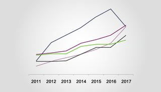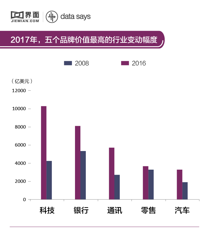 2008年时,银行业中具有高品牌价值的公司中最多,其次依次为科技、零售、通讯和汽车业。十年之后,不仅各行业内公司的品牌价值整体提升,排名也相对出现变动。科技业成为了高品牌价值公司最多的行业,而零售业从原来的第三大高品牌价值行业落至第四名。