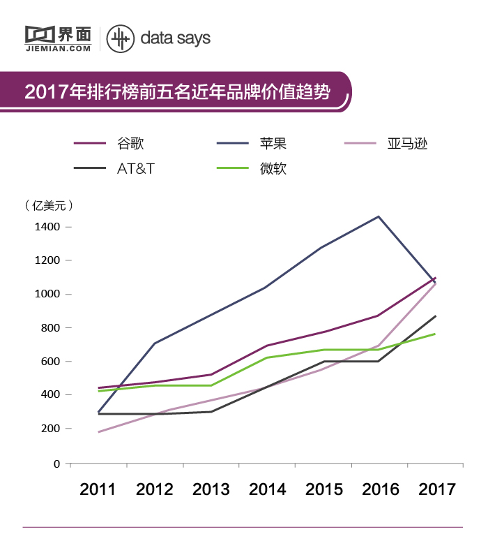 谷歌今年的品牌价值为1095亿美元,取代苹果成为全球范围内最具价值的品牌,亚马逊排名第三。苹果品牌价值1071亿相比去年1459亿跌了27%,被发展趋势稳定的谷歌赶超;全球前5强中的AT&T和亚马逊在今年呈现出较大上升幅度。