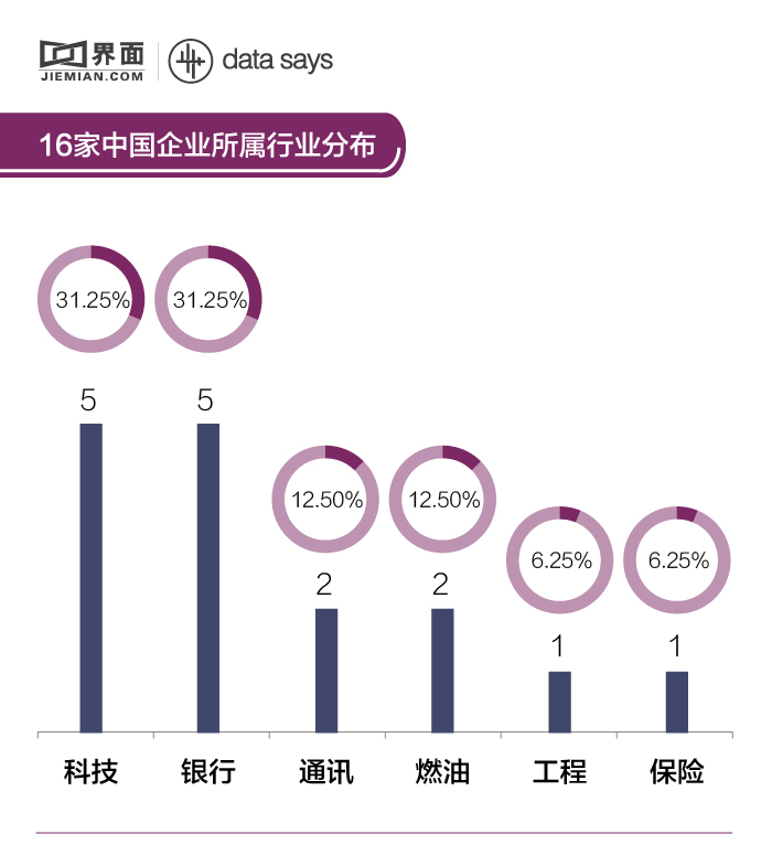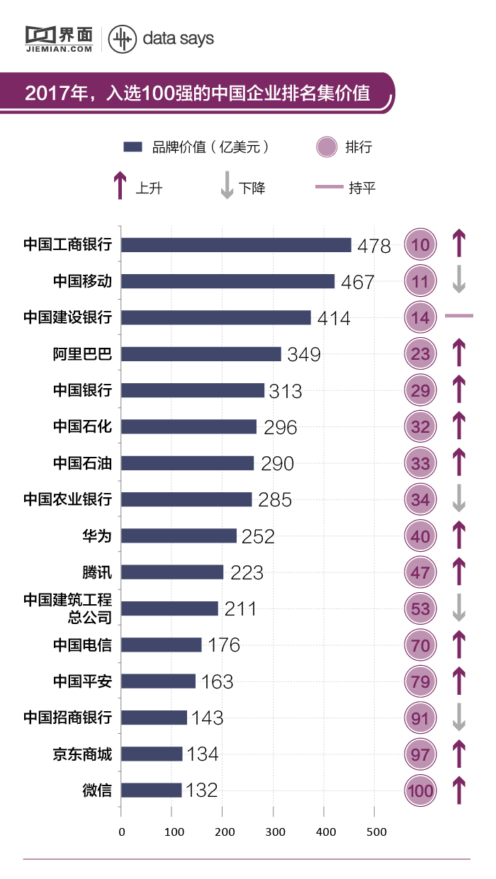此次入榜100强的中国企业中,科技业与银行业的公司最多,科技行业入榜的公司分别为阿里巴巴、华为、腾讯、京东商城、微信。
