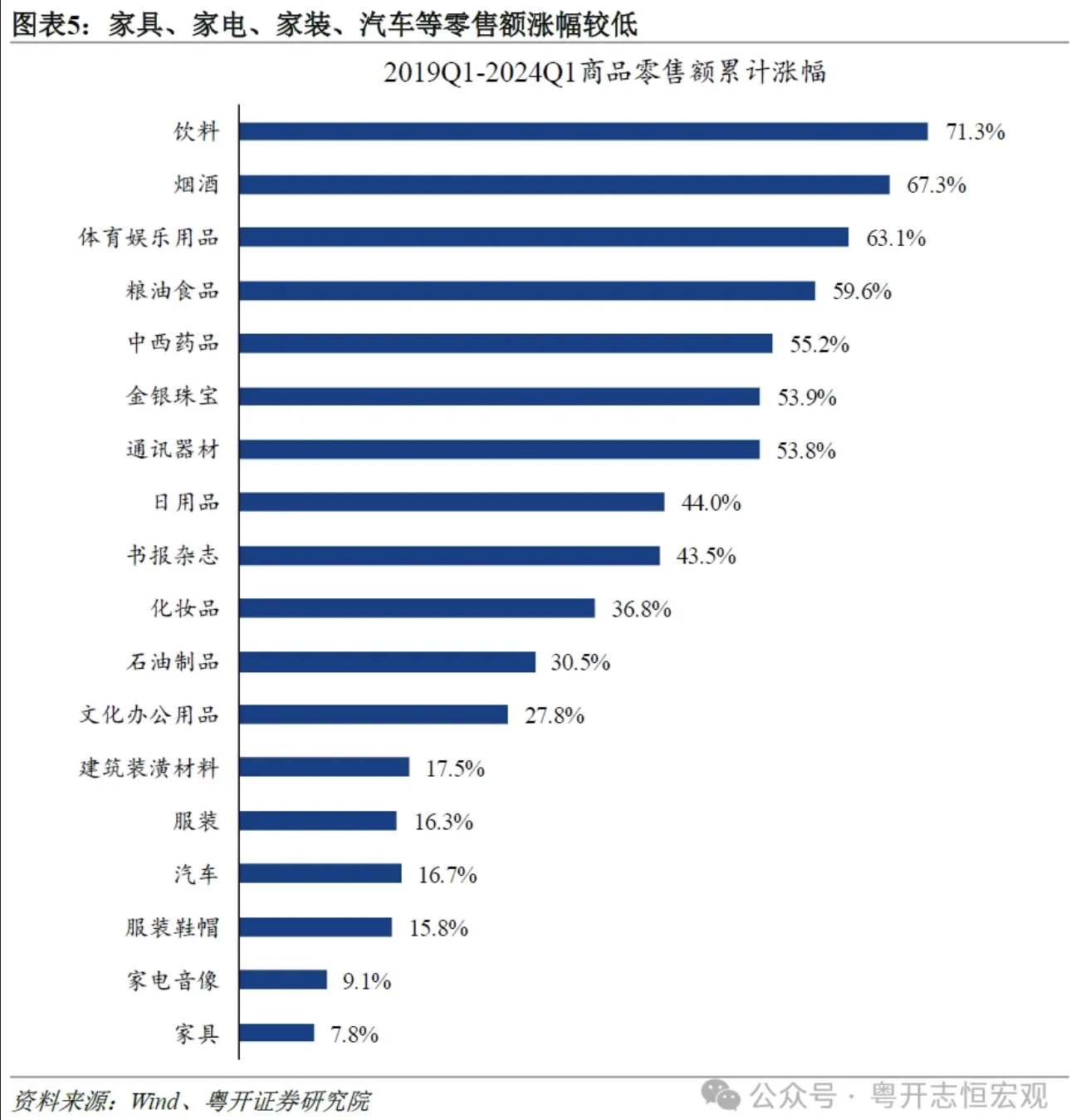 需求端来看,受房地产市场低迷、居民就业和收入预期不稳等因素影响,耐用消费品需求不振。2024年一季度相较2019年同期,饮料、食品、日用品等非耐用品的零售额累计涨幅超40%,而家具、家电、家装、汽车等耐用品的零售额累计涨幅不到20%。