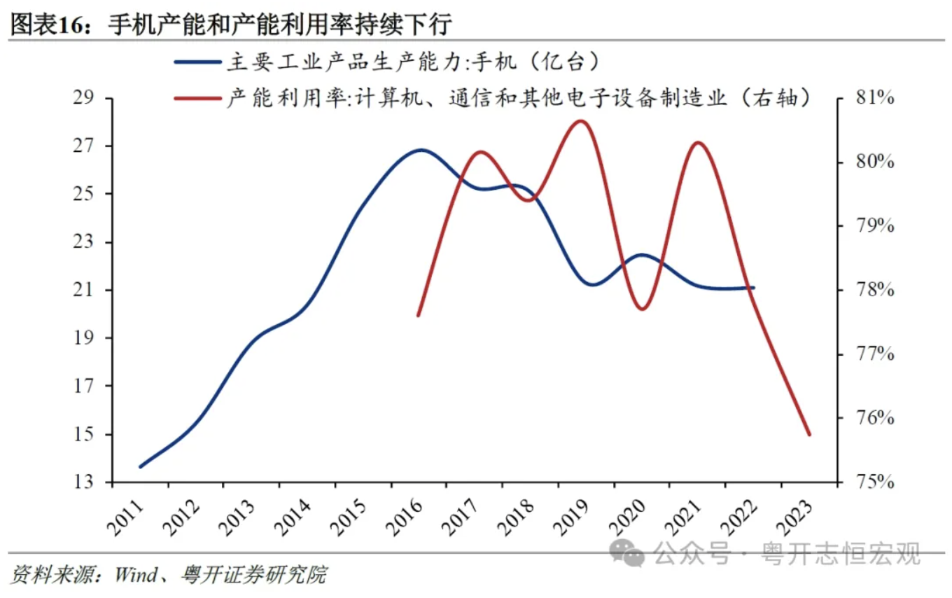 三是计算机、手机等行业面临市场饱和与激烈竞争。手机产能于2016年触顶,此后持续收缩;不仅如此,2021年以来计算机、通信和其他电子设备制造业的产能利用率也不断下行。2024年3月计算机制造业和通信设备制造业PPI同比分别为-0.6%和-2.9%。