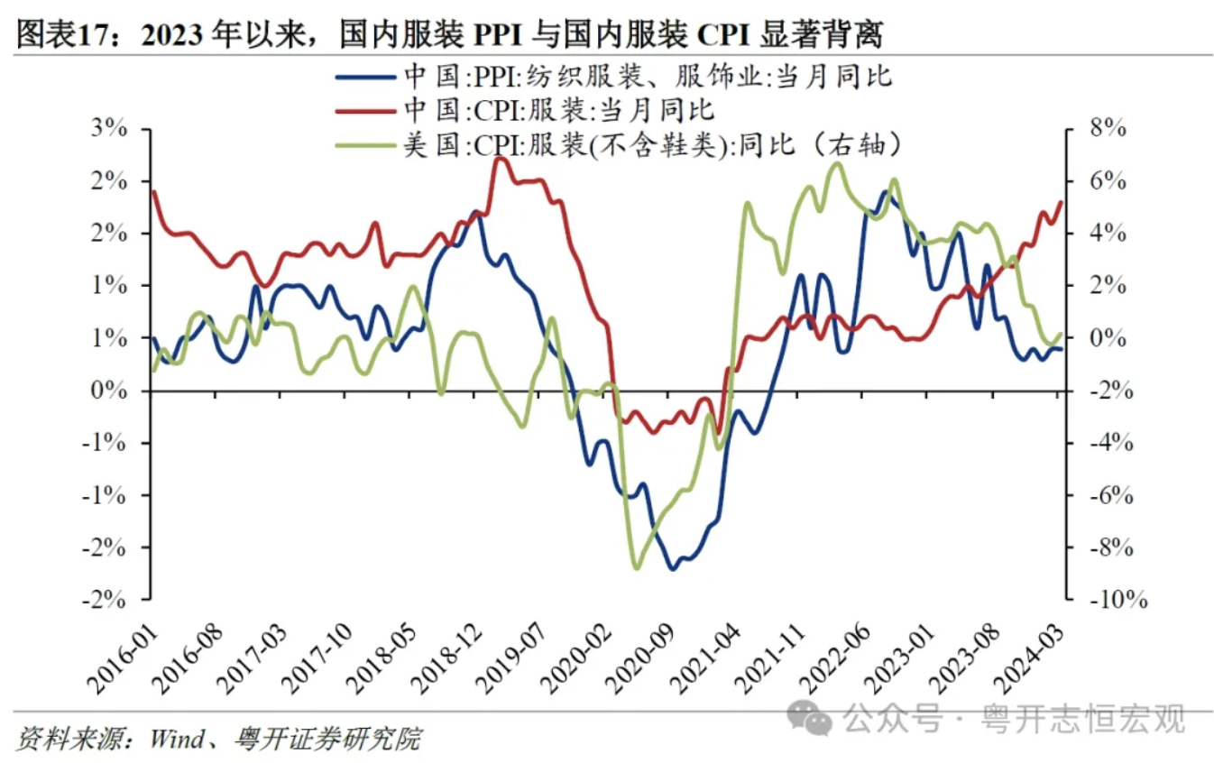 2023年以来,国内服装PPI与国内服装CPI显著背离,反而与美国服装CPI走势一致。正常而言,无论是成本推动还是需求拉动,国内同一商品的CPI和PPI应具有较强相关性。然而2023年1月至2024年3月,国内服装CPI从0.6%一路升至1.8%,国内服装PPI同比却从1%降至0.4%,与此同时,美国服装CPI同比从3.7%降至0.2%。