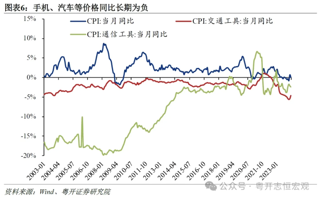 供给端来看,电子产品、汽车等由于技术进步、规模经济、行业竞争激烈,价格长期趋于下行,客观上为消费者带来了实惠。除中美贸易摩擦和疫情期间供应链紧张等少数供给冲击以外,交通工具和通信工具CPI同比一直为负。此外,2024年一季度通讯器材零售额较2019年同期增长53.8%,需求并不低,但通信工具CPI同比仍下降2.1%,也表明供给因素占主导。