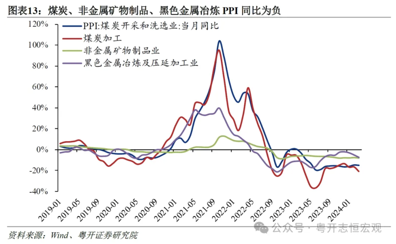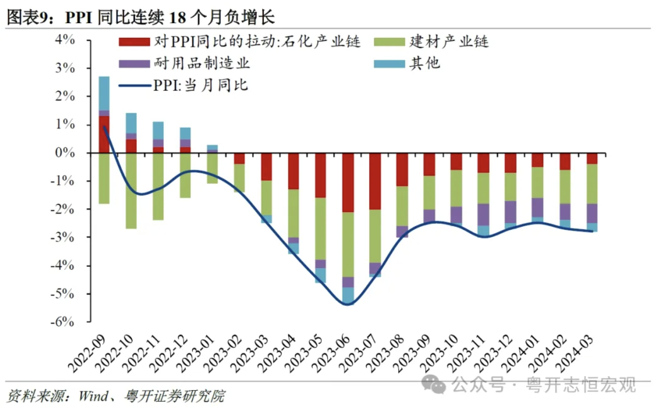 2022年10月以来,PPI同比已连续18个月负增长。2024年3月,PPI同比-2.8%,其中石化产业链、建材产业链、耐用品制造业对其的拉动分别为-0.4、-1.4和-0.7个百分点,合计贡献了PPI同比降幅的近90%。