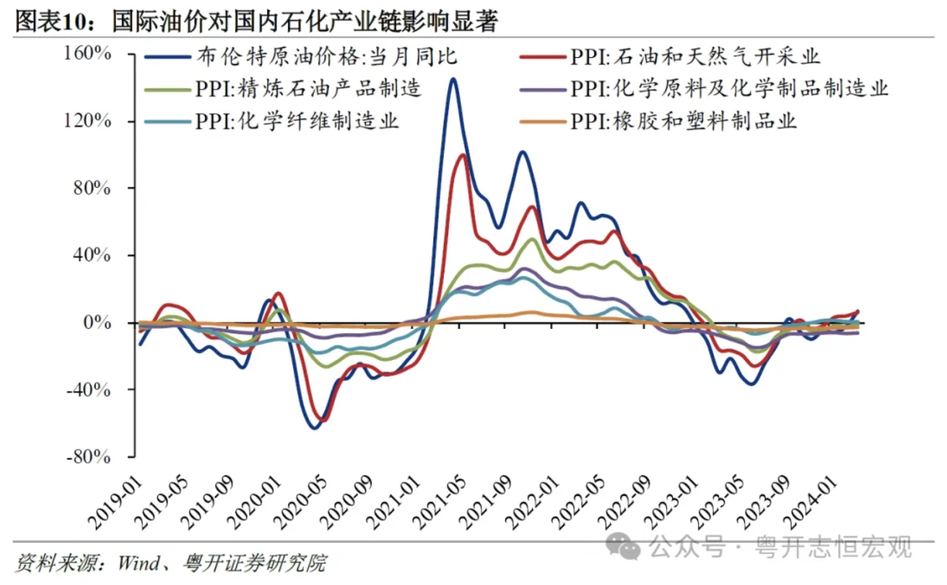 石油是工业的血液,既是重要的化石能源,也是一系列化工产品的原材料。石油价格是国际定价,对国内石化产业链相关价格影响显著,布伦特原油价格同比领先国内油气开采PPI同比一个月左右。