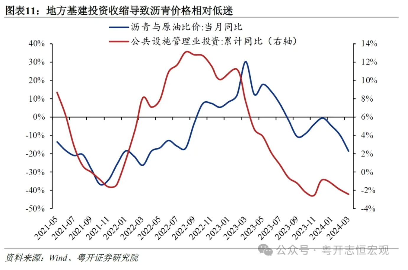 以沥青为例,沥青主要从石油中制取,被广泛使用于道路等基础设施建设。2023年以来,沥青与原油比价(衡量沥青的相对价格)同比持续下行,主因地方传统基建投资同比显著收缩。地方政府受化债和财政紧平衡约束,土地出让收入因房地产市场低迷而大幅下滑,2024年一季度主要依赖地方财政资金的公共设施管理业投资同比降至-2.4%。
