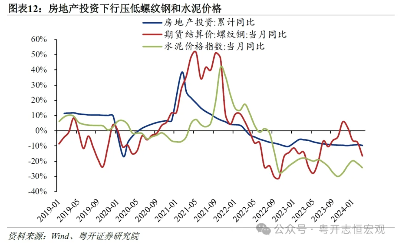 房地产投资下行压低了螺纹钢、水泥等建材价格,并传导至上游的煤炭等行业。3月煤炭开采、煤炭加工、非金属矿物制品、黑色金属冶炼PPI同比分别为-15%、-20.9%、-8.1%和-7.2%,建材产业链对总体PPI同比向下拉动1.4个百分点。