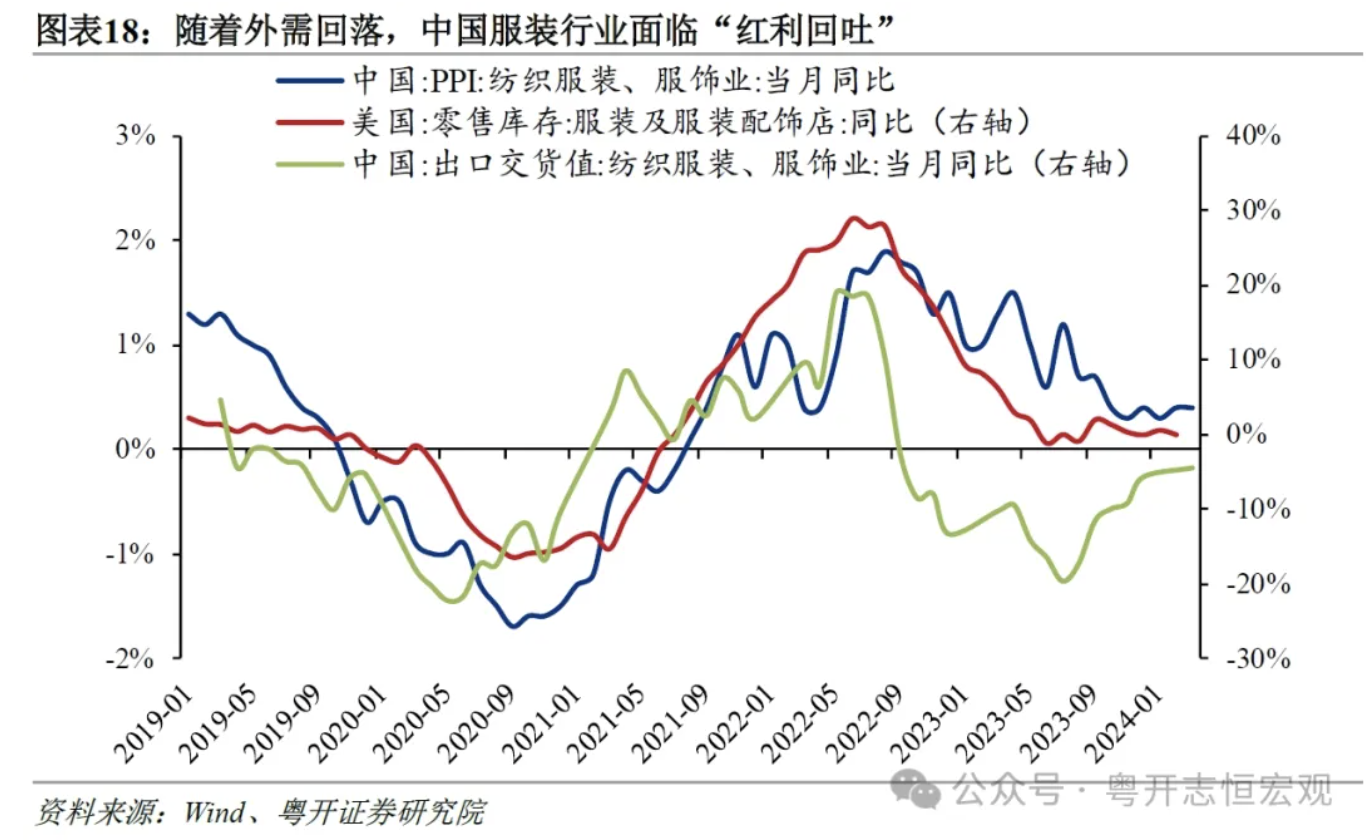 国内服装PPI与美国服装CPI的相关性,源于疫情爆发后的海外需求和价格变化。2021-2022年,中国服装行业显著受益于海外订单增加和价格上涨;随着海外生产恢复和价格回落,中国服装行业也面临“红利回吐”,出口交货值和单价均大幅回落。