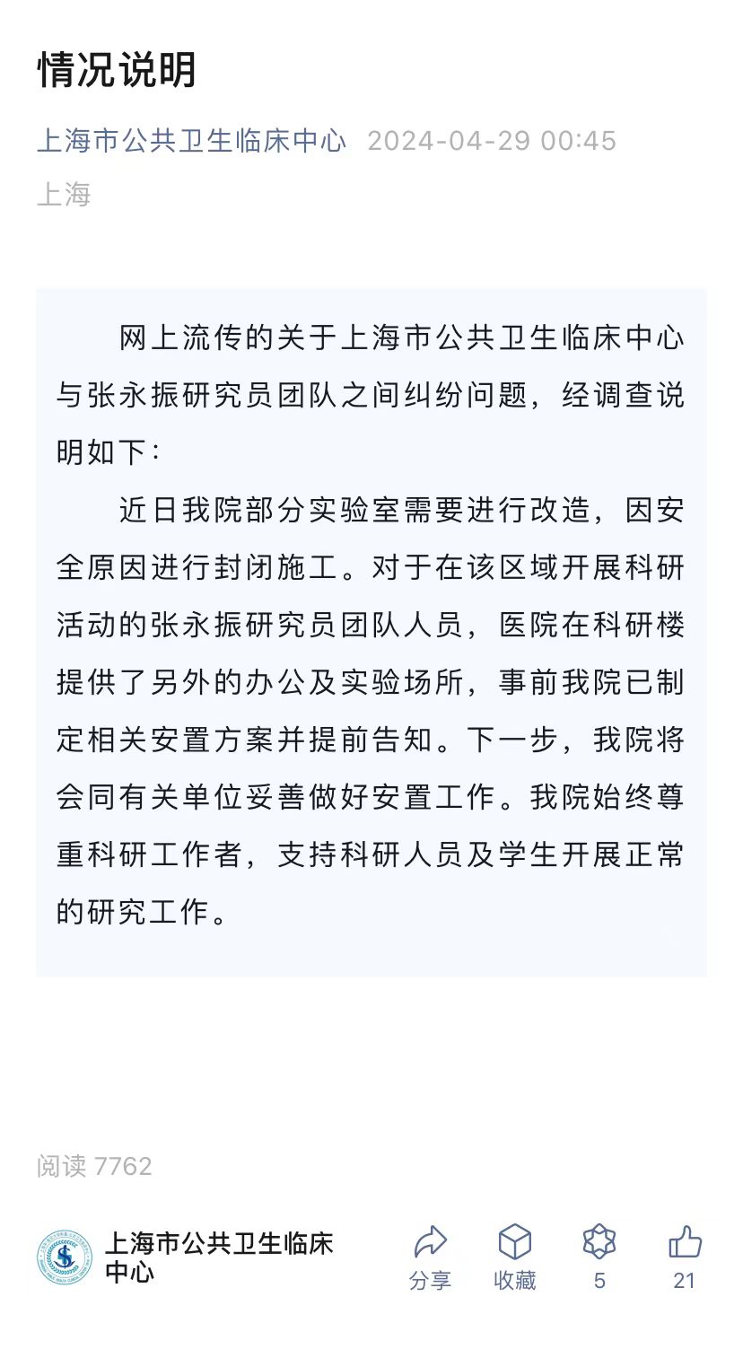 4月29日,针对网络流传的关于上海市公共卫生临床中心(下称“上海市公卫中心”)与张永振研究员团队之间的纠纷问题,上海公卫中心发布情况说明。