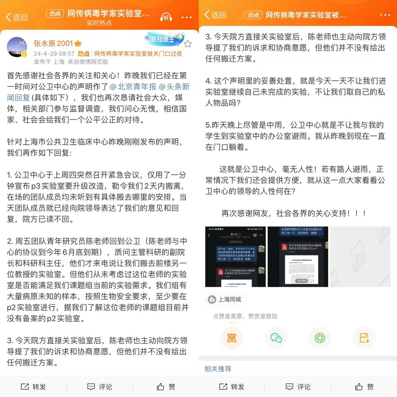 4月29日凌晨,张永振本人通过微博转发了前述用户的长文,并在今日9点57分发布新文章。张永振微博发文的内容主要是针对上海市公卫中心凌晨发布声明后的一些异议,主要围绕公卫中心所声称的“有事前告知”和“有妥善处置”。