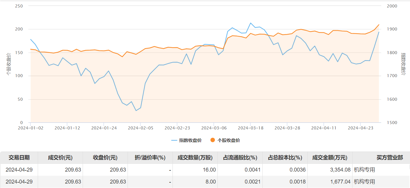 宁德时代4月29日大宗交易成交24万股,成交额5031.12万元,占当日总成交额的0.55%,成交价209.63元,较市场收盘价209.63元持平。