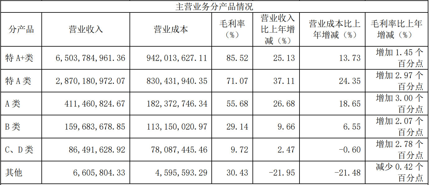 今世缘出厂指导价300元以上的“特A+类”产品收入为65亿元,同比增长25.13%,出厂指导价100元—300元的“特A类”产品收入28.7亿元,同比增长37.11%。