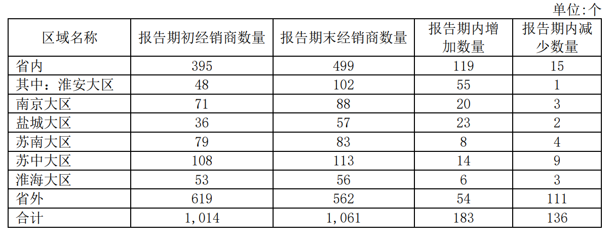 报告期初该公司省内经销商数量为395个,报告期末为499个;省外报告期初经销商为619个,报告期末为562个,减少了57个。在经销商整体数量增加的情况下,省外经销商数量进一步缩水。