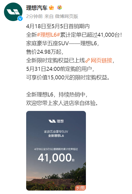 理想汽车微博5月6日消息,4月18日至5月5日首销期内,理想L6累计定单已超过41000台。