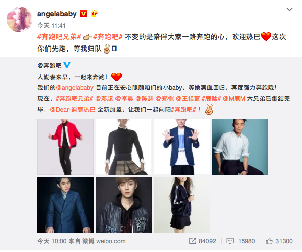今天,奔跑吧节目组官方宣布,baby将暂别节目录制,迪丽热巴加盟,和邓超、李晨、郑凯、陈赫、鹿晗、王祖蓝六位老成员一起组成新跑男团。对此,Angelbaby也通过个人微博转发回应,并表示欢迎热巴,“你们先跑,等我归队。”