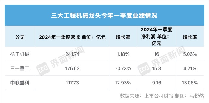 一季度是基建开工的传统淡季,中联重科的营收、净利润增速仍在三家头部公司中表现最好。同期,徐工机械和三一重工净利润均在16亿元左右,前者略高0.2亿元,后者增利不增收。