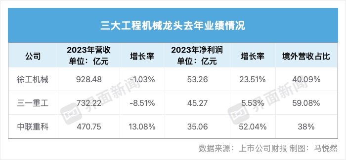 在三家企业中,营收和净利增速表现最优的是中联重科(000157.SZ),该公司去年净利润增速超过五成。