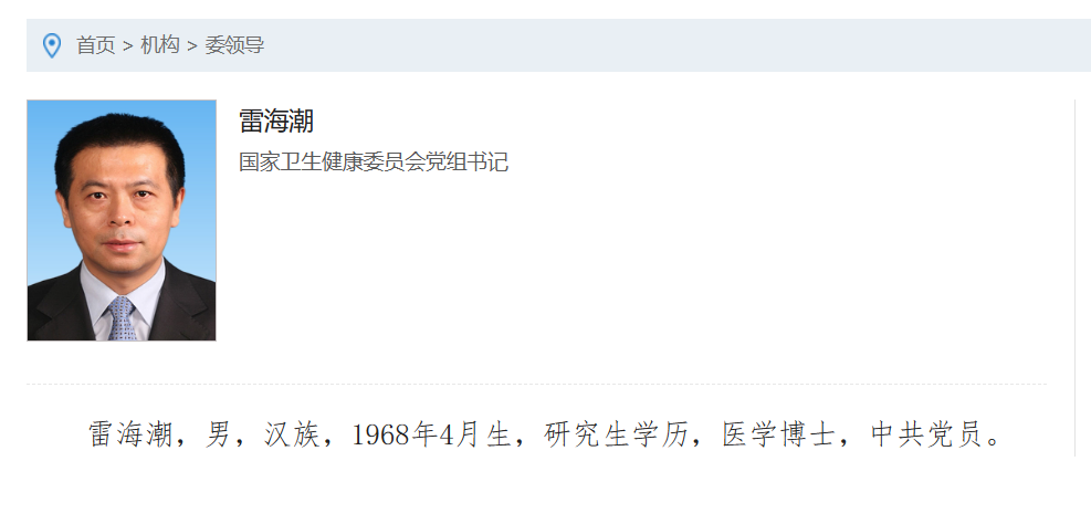 5月6日,国家卫生健康委员会网站信息显示,原国家卫健委副主任雷海潮已经升任国家卫健委党组书记,此前国家卫健委党组书记为马晓伟。此即意味着,国家卫健委迎来新任“一把手”。