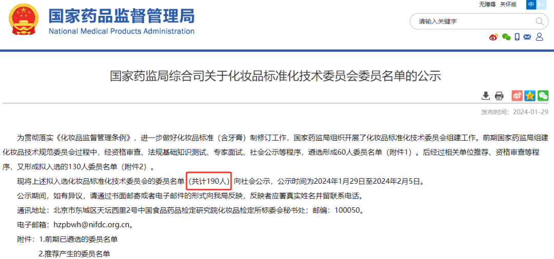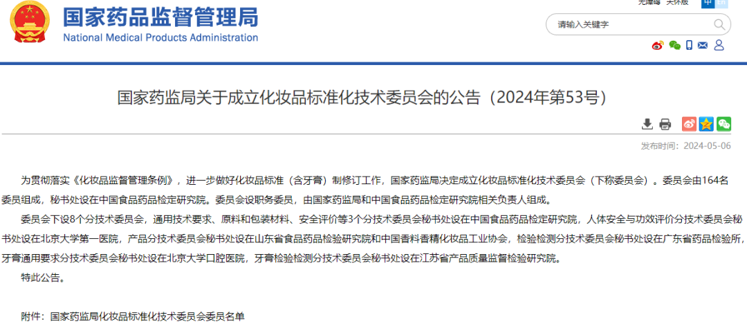 5月6日,国家药监局发布了“关于成立化妆品标准化技术委员会的公告(2024年第53号)(下称“第53号公告”)”,不仅宣布成立化妆品标准化技术委员会(下称“委员会”),164名委员会成员名单也随之公布。