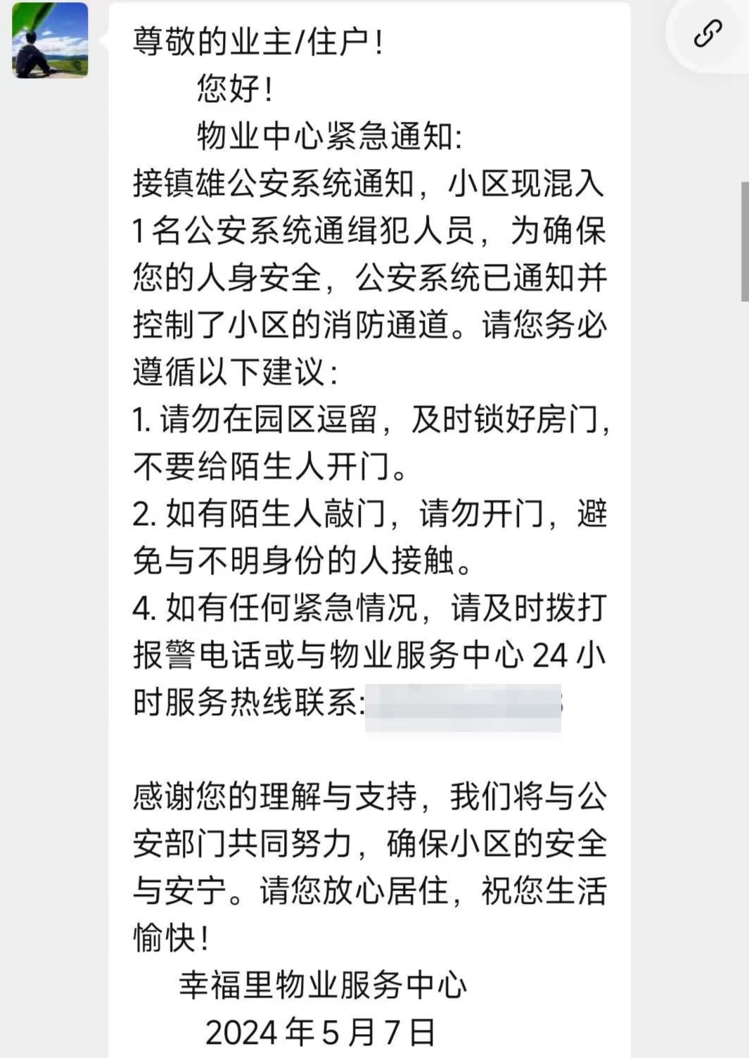 据红星新闻报道,5月7日,网传信息显示,云南省昭通市镇雄县康养小镇幸福里物业向业主、住户发布紧急通知称,小区混入1名警方通缉人员,警方已通知并控制了小区的消防通道。物业提醒业主、住户“请勿在园区逗留,及时锁好房门,不要给陌生人开门”“如有陌生人敲门,请勿开门,避免与不明身份的人接触”。该物业公司一名工作人员证实了上述消息,并称7日中午从警方接到相关通知。