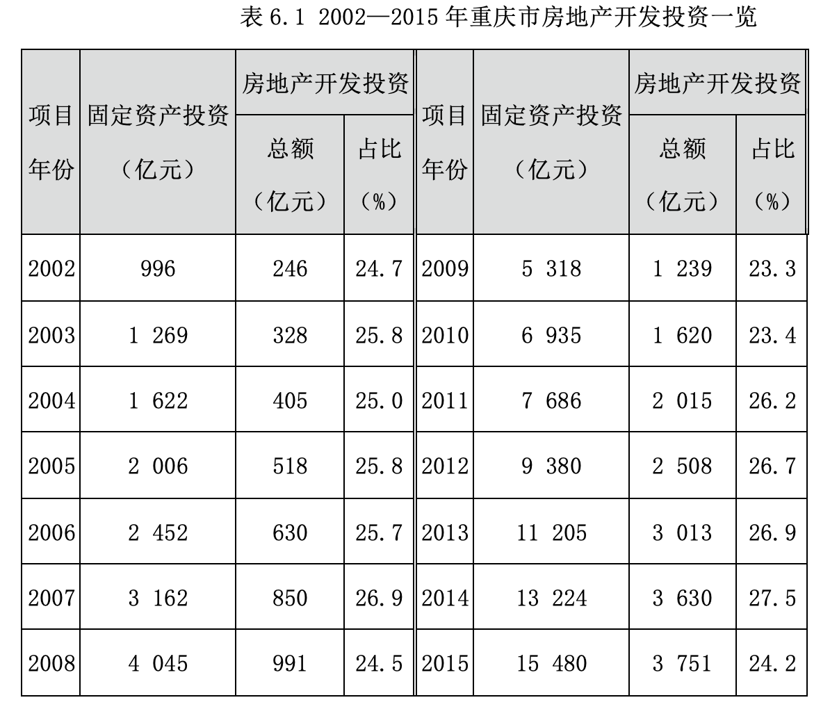 将房地产投资控制在固定资产投资的25%左右,就能从宏观层面上控制住房地产开发总量。从产业发展角度看,一个城市如果长期超过这个比例,房地产领域就会吸附过多资金和资本,实体经济就会被削弱。房地产业和实体经济长期处于结构性失衡的状态,就会影响城市的可持续发展后劲。从城市配套条件看,如果一个城市1 000亿元固定资产投资中,有600多亿元都投资于房地产,房地产投资占固定资产总投资的比重高达百分之六七十,虽然房产建设大干快上,但城市基础设施和工商实体经济的投资没有跟上,以后要么就是没人居住的“空城”,要么就是无法居住的“烂尾楼”。基于此,从2002年起,重庆始终把25%左右的投资占比作为调控房地产市场的一道“硬杠杠”,而且年年都达到了调控目标(见表6.1)。