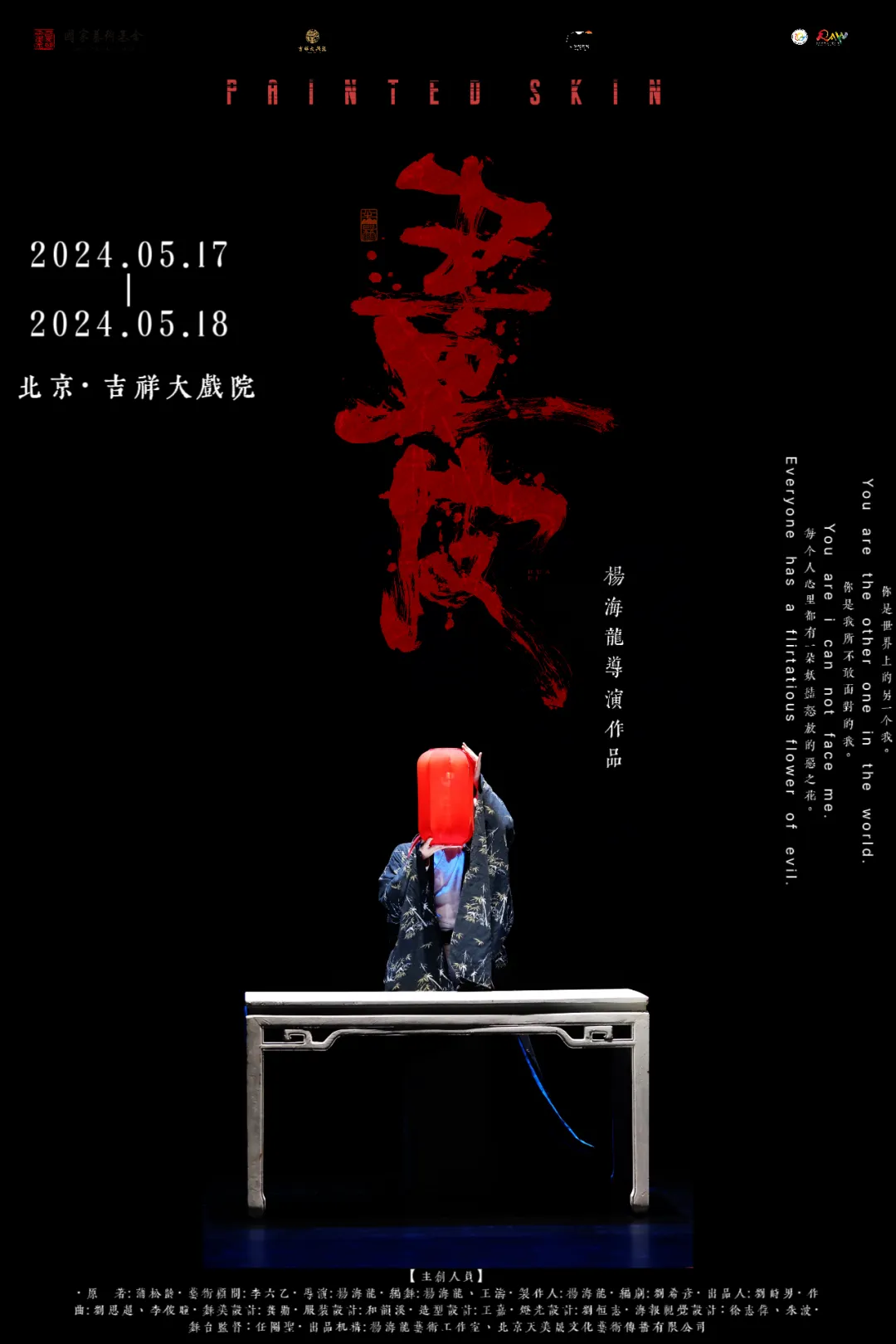 该剧目的另一个独特之处在于采用全男班底出演,由京剧武生张超、青年舞蹈家沈立原等人领衔主演,跨越性别的重新演绎颠覆了《画皮》的表演套路,也让整个剧目披上了一层隐喻性的“画皮”。剧中还引入了两个新角色“欲”和“魔”,巧妙象征了陈氏内心善恶念头的博弈,展现了人心如何游走于天堂和地狱之间。