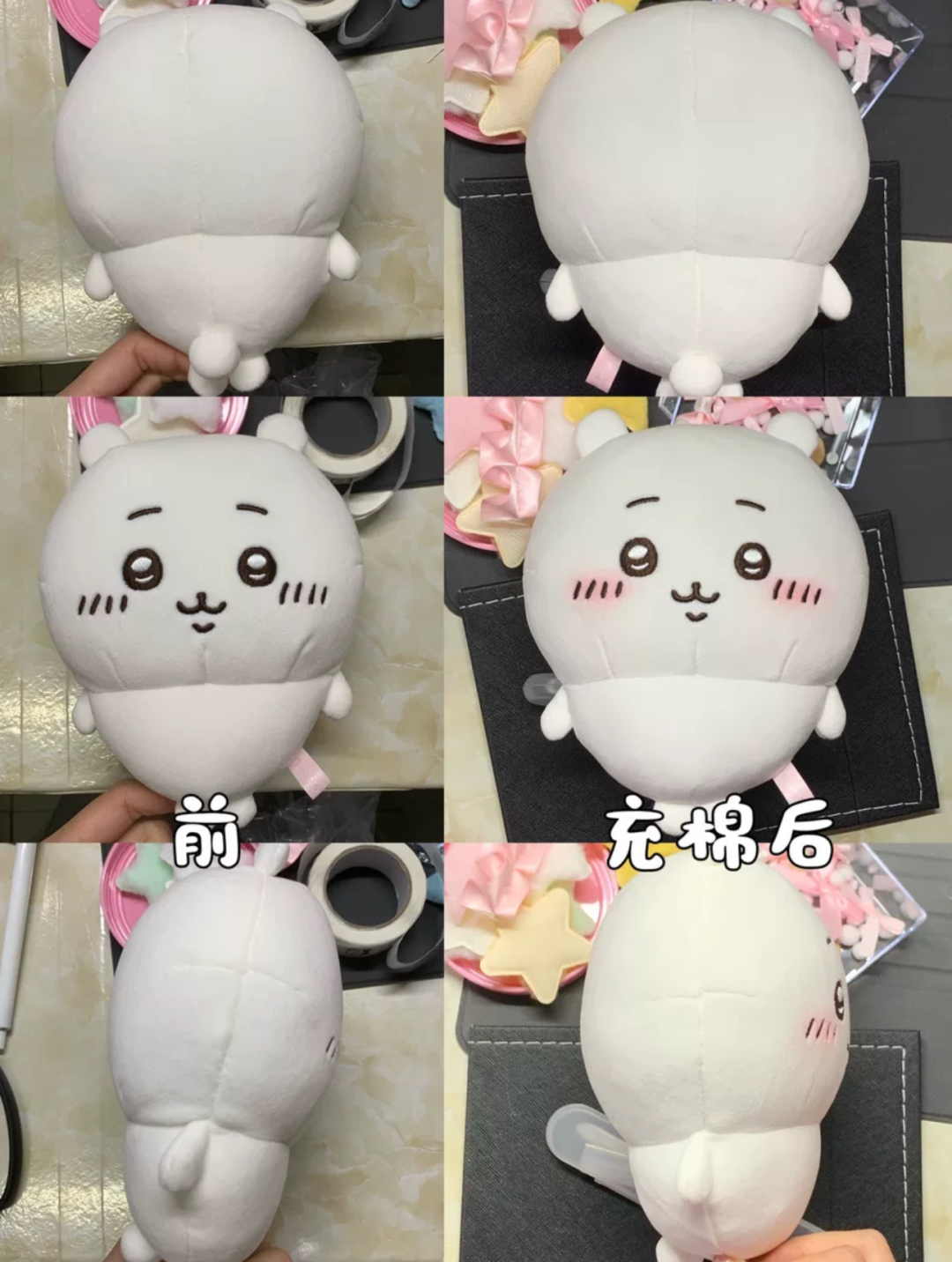 由于毛绒玩偶的棉花填充物的性质,加之品控的问题,一些chiikawa粉丝在买到周边后会或自己主动上手或找人帮忙DIY,将公仔的身体填充得更加饱满可爱。