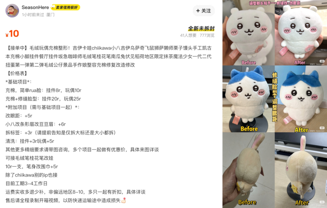 在闲鱼上搜索「chiikawa整容」,会发现有不少人做「娃娃医生」的生意。相较于以前火出圈的旧娃娃修复,这种生意往往发生在娃娃到手之前。
