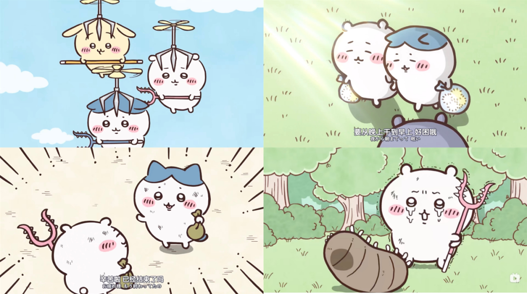 获得收入这件事堪称艰苦。有一集小八和吉伊一起熬夜摘花,到天亮了工作才结束,比996更辛苦的工作之后,还能眯着眼睛说要回去吃点东西好好休息。一起去讨伐怪物时,会吓得发抖,也要勇敢再尝试冲锋。