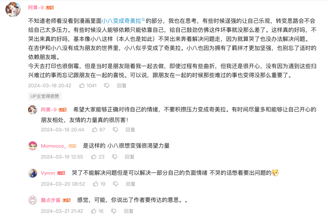 在B站,一个名为「小八处理问题的思维 妈妈要反复学习」的视频下,评论区的网友们会从小八想到自己现实生活如何处理问题。
