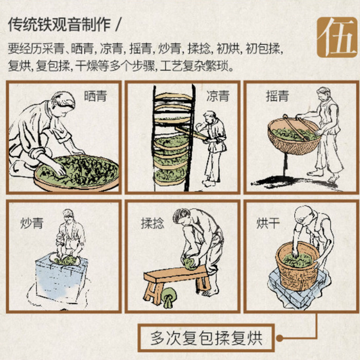 浓香型:以铁观音毛茶为原料,经过拣梗、筛分、风选、烘焙等特定工艺过程制成,外形紧结、色泽乌润、香气浓郁、滋味醇厚。