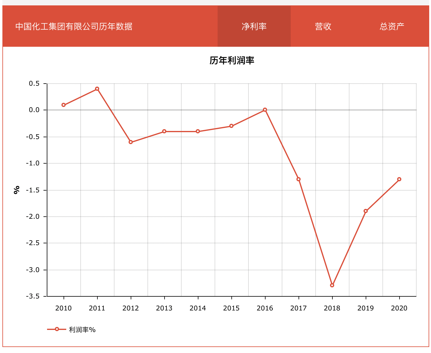 《财富》世界500强数据显示,2012年以来,中国化工集团的利润率一直为负,并于2018年达到历史最低值,利润率为-3.3%;2020年回升至-1.3%。