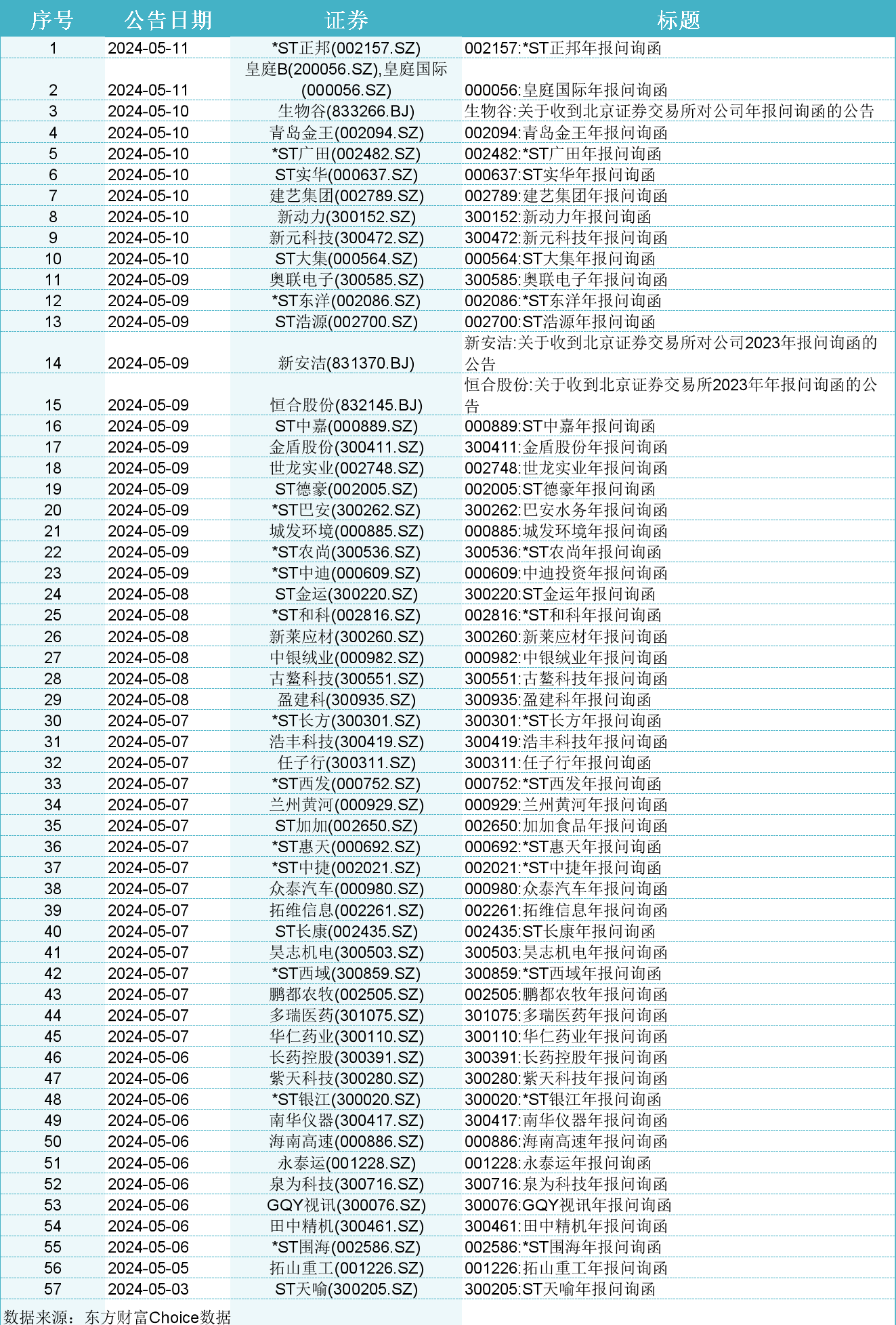 根据界面新闻统计,5月以来截至5月12日,A股已经有57家上市公司收到年报问询函,涉及股东户数达233万户(未去重)。这其中,39家企业2023年处于亏损状态。这些公司多是市值小于50亿元的上市公司。