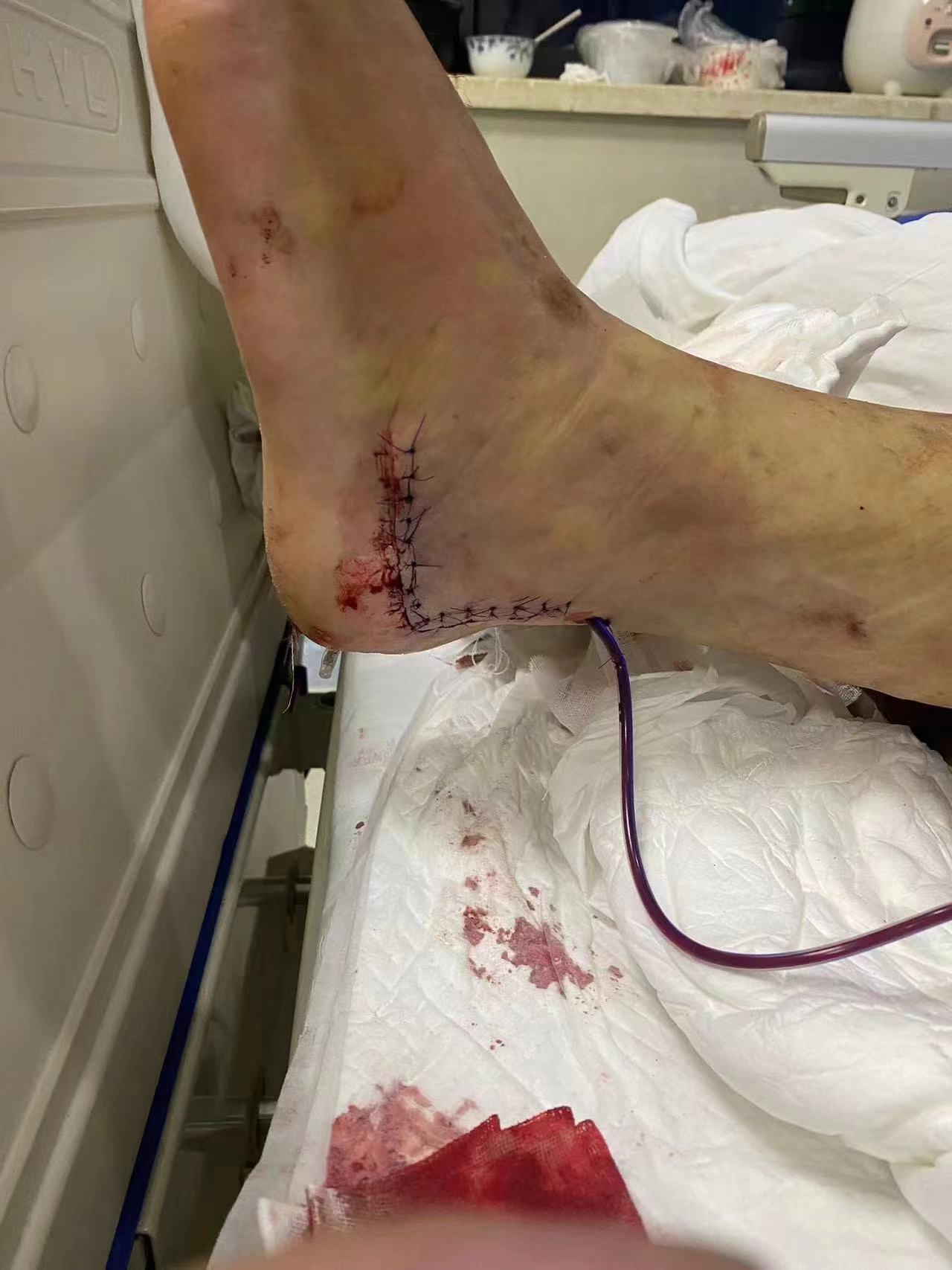 现场视频和照片显示,嫌犯出门逃至街道,朱晓冬紧随其后,出门时再次摔倒,但仍试图起身追捕。他的裤子被撕破,膝盖、手掌等多处流血。在同事的帮助下,他被送到中国人民解放军中部战区总医院,医生认为其伤势过重,建议转院。后来,他在华中科技大学同济医学院附属协和医院车谷院区进行了跟骨粉碎性骨折手术。