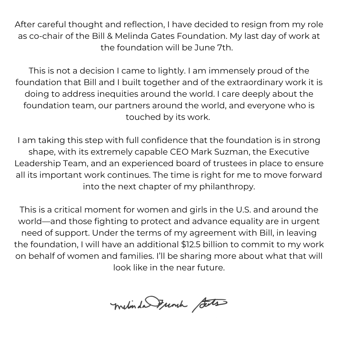 5月14日,梅琳达·盖茨在社交平台X上发布声明称,她将辞去比尔及梅琳达·盖茨基金会联席主席的职务,以推动她的慈善事业“进入新的篇章”。声明称6月7日是她在基金会工作的最后一天,在离开基金会时,她将获得额外的125亿美元用于其为妇女和家庭所做的工作。